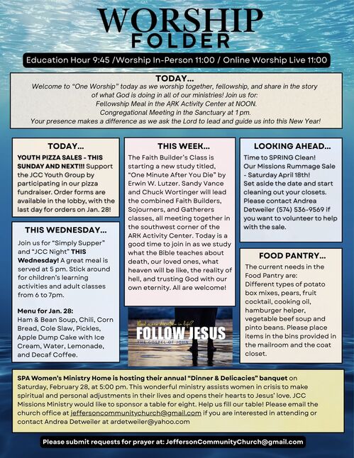 Join us for “Simply Supper” and “JCC Night” this Wednesday! A great meal is served at 5 pm. Stick around for children’s learning activities and adult classes from 6 to 7pm. This Week’s Menu on January 28th: Ham & Bean Soup, Chili, Corn Bread, Cole Slaw, Pickles, Apple Dump Cake with Ice Cream, Water, Lemonade, and Decaf Coffee.