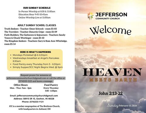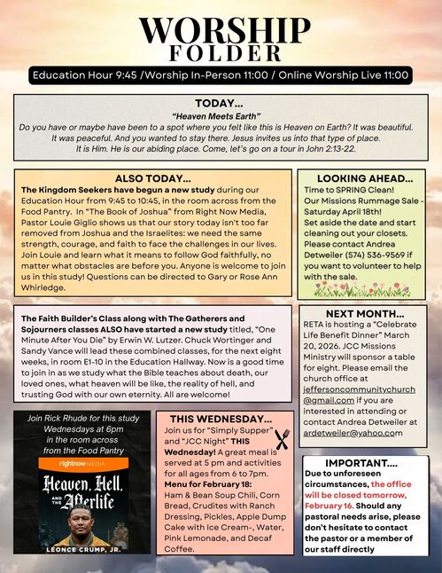 Join us for “Simply Supper” and “JCC Night” this Wednesday! A great meal is served at 5 pm. Stick around for children’s learning activities and adult classes from 6 to 7pm. Menu for February 18: Ham & Bean Soup Chili, Corn Bread, Crudites with Ranch Dressing, Pickles, Apple Dump Cake with Ice Cream-, Water, Pink Lemonade, and Decaf Coffee.