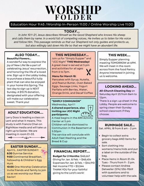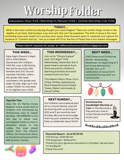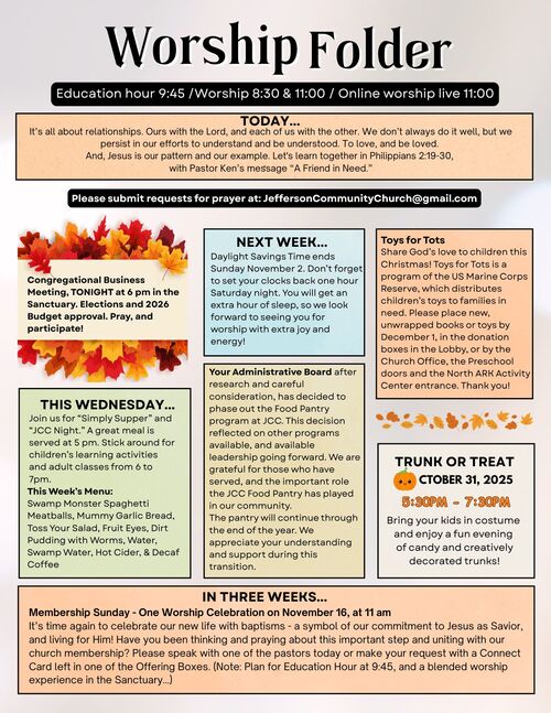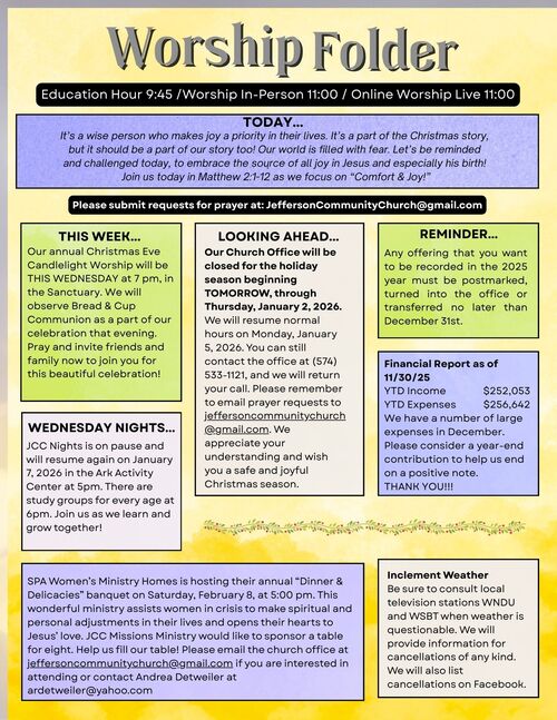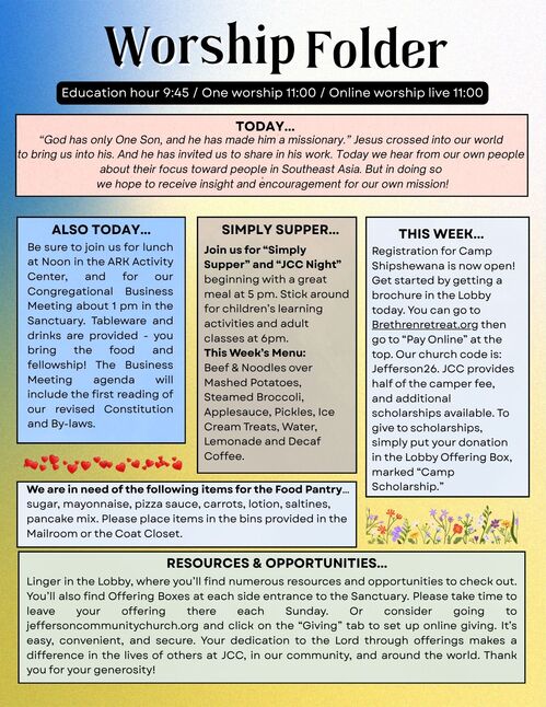 Here you'll find a few announcements. Be sure to scroll down to see all of our announcements in the Worship Folder. There is a complete printable version for your convenience!