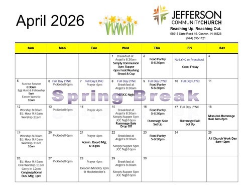 Please note that there will be NO JCC NIGHT or Simply Supper Wednesday, April 8 only, due to Spring Break. Enjoy time with your family!