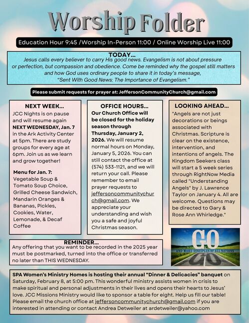 Jesus calls every believer to carry His good news. Evangelism is not about pressure or perfection, but compassion and obedience. Come be reminded why the gospel still matters and how God uses ordinary people to share it in today’s message, “Sent With Good News: The Importance of Evangelism.”
